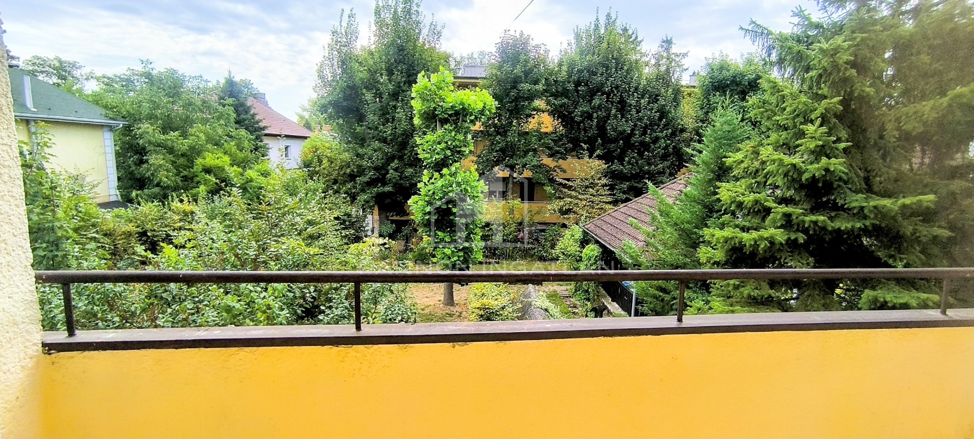 A nagy erkélyről zöld parkra nyíló kilátás, ideális reggeli kávézáshoz vagy esti pihenéshez.