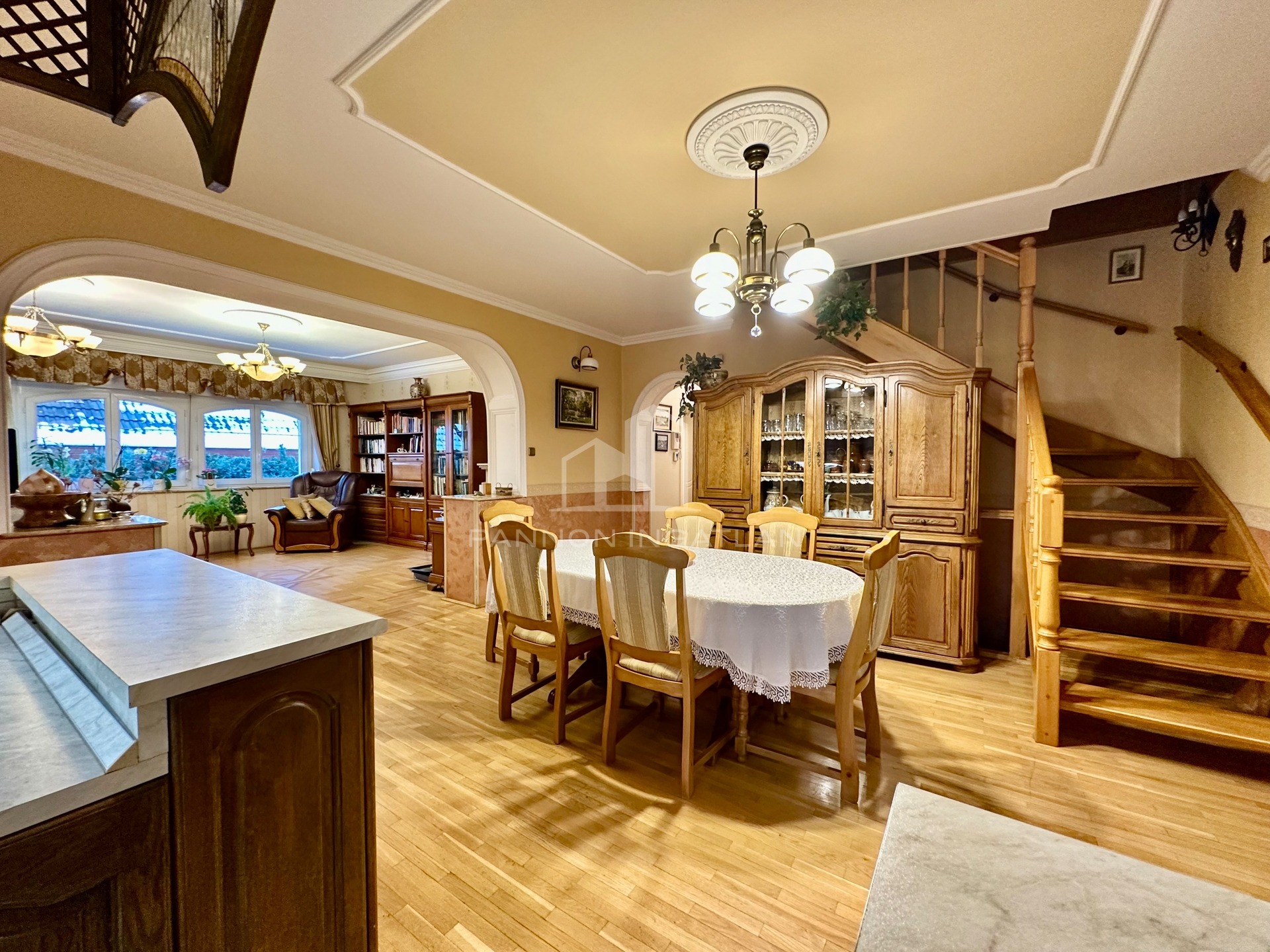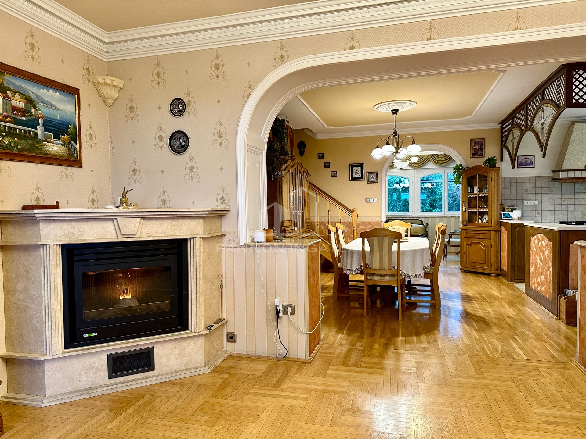 Tágas nappali, konyha–étkező, dolgozó, zongoraszoba, fürdő, szauna, kamra és nagy terasz, amely ideális családi és baráti összejövetelekhez, közvetlen kapcsolattal a kerthez és a természethez.