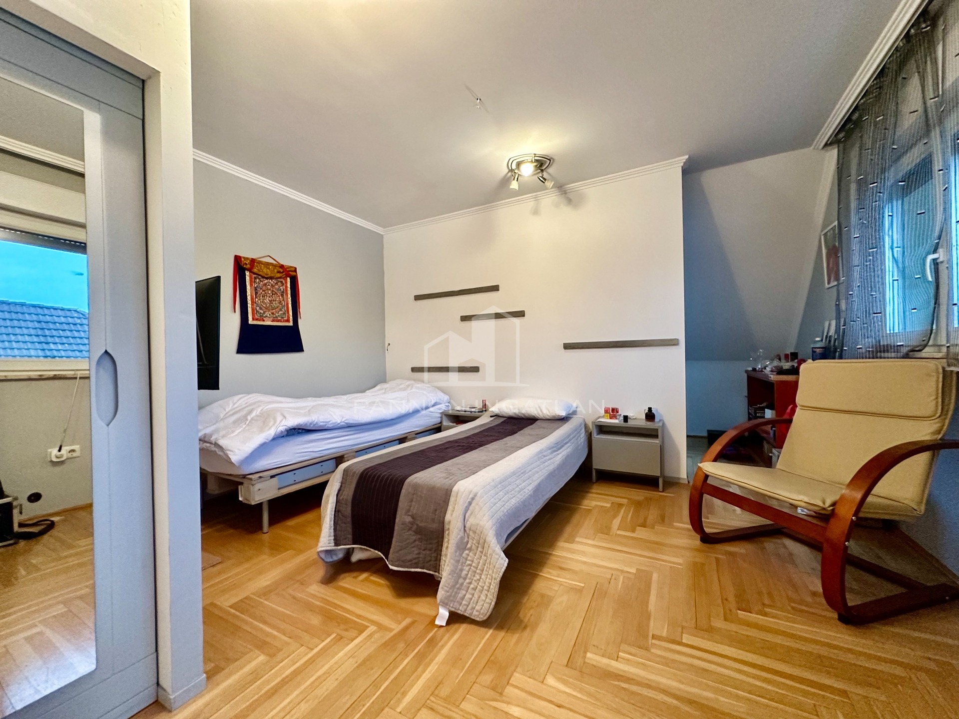 Három hálószoba, több gardrób, fürdő, közlekedők és egy külön penthouse jellegű tér, amely akár önálló lakrészként is használható.