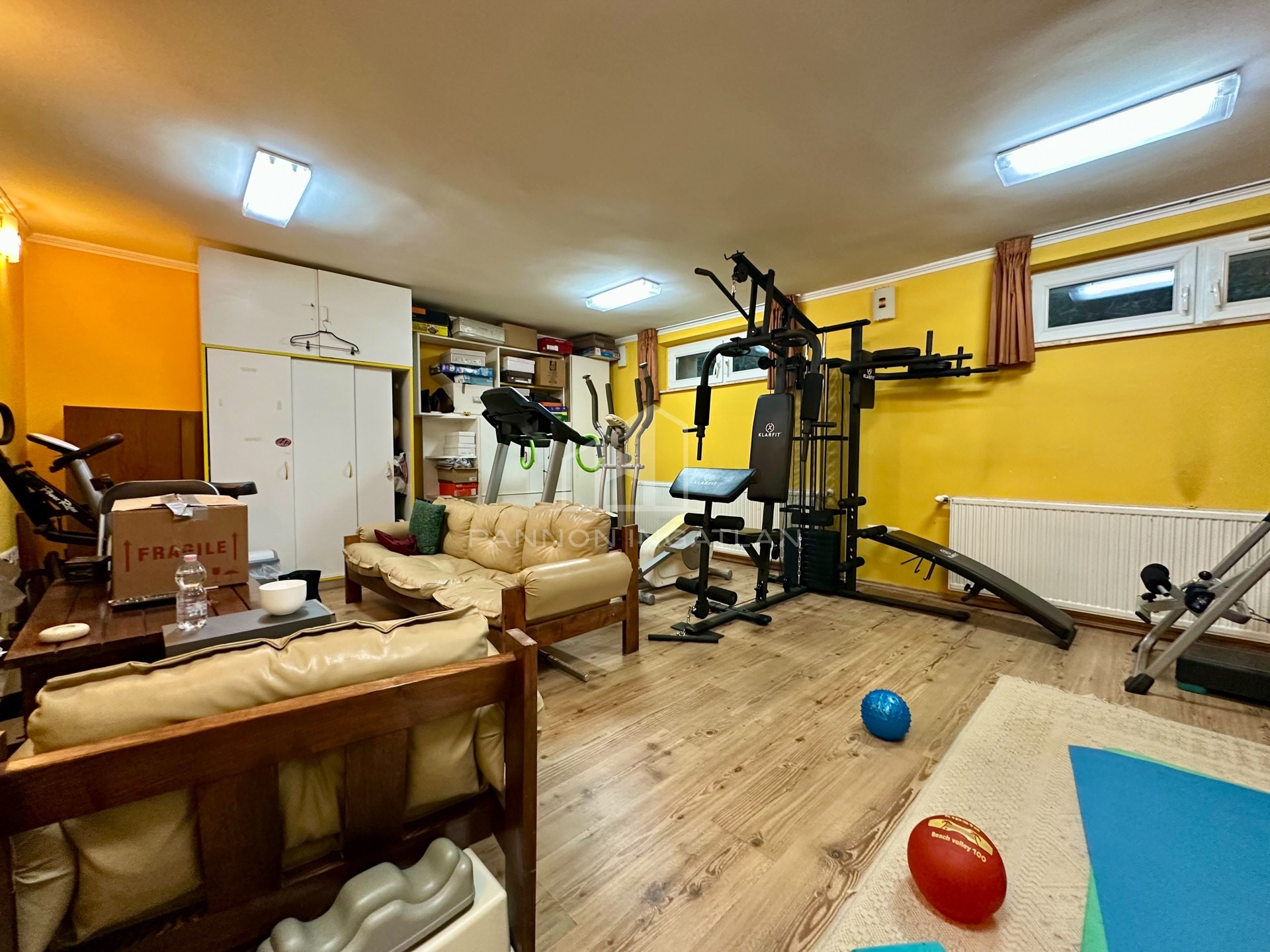 Kétállásos garázs, konditerem, iroda, mosókonyha, gépészet és tárolók.