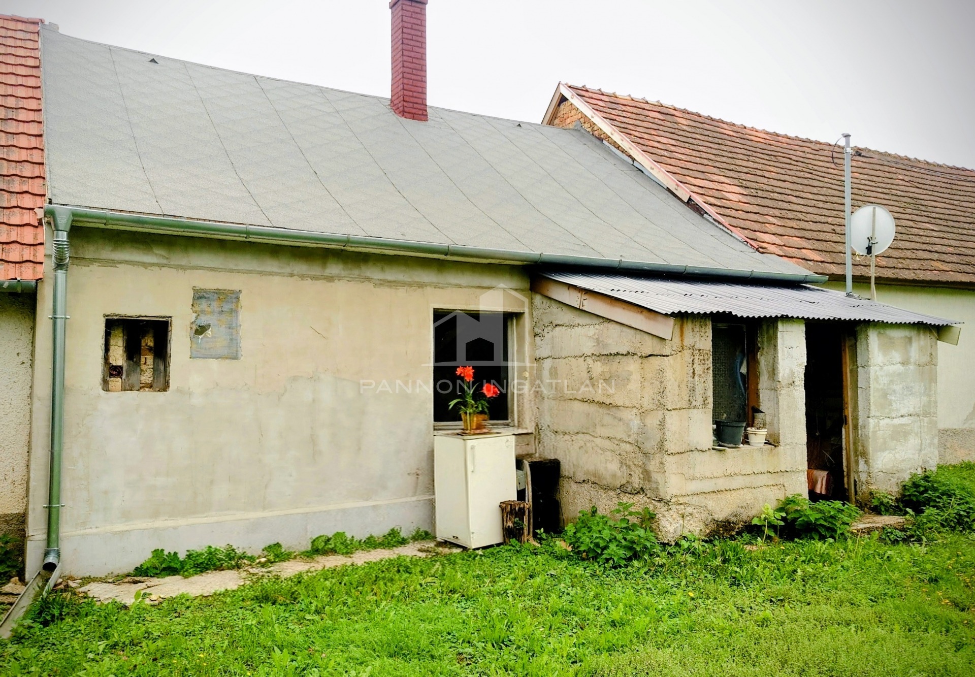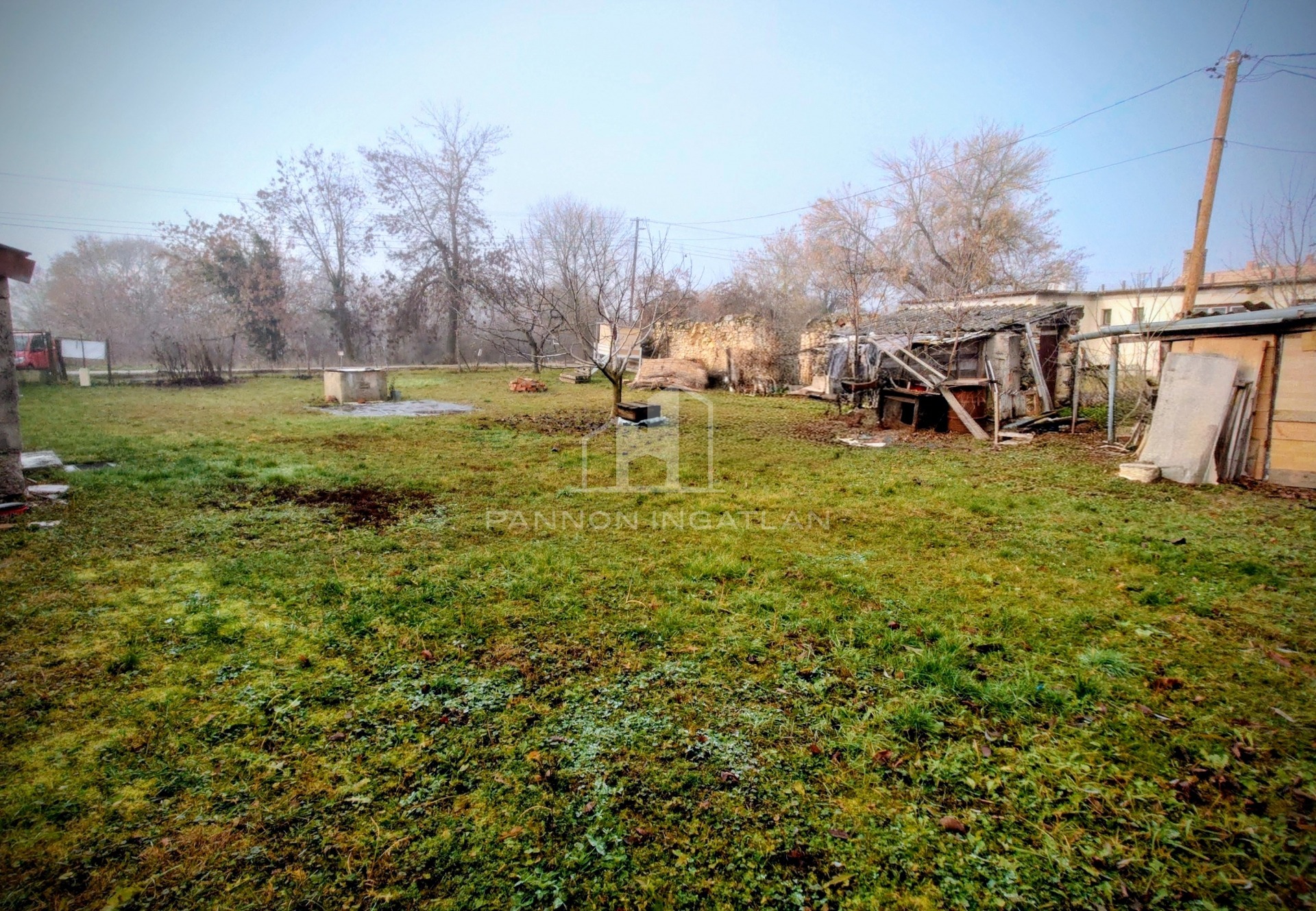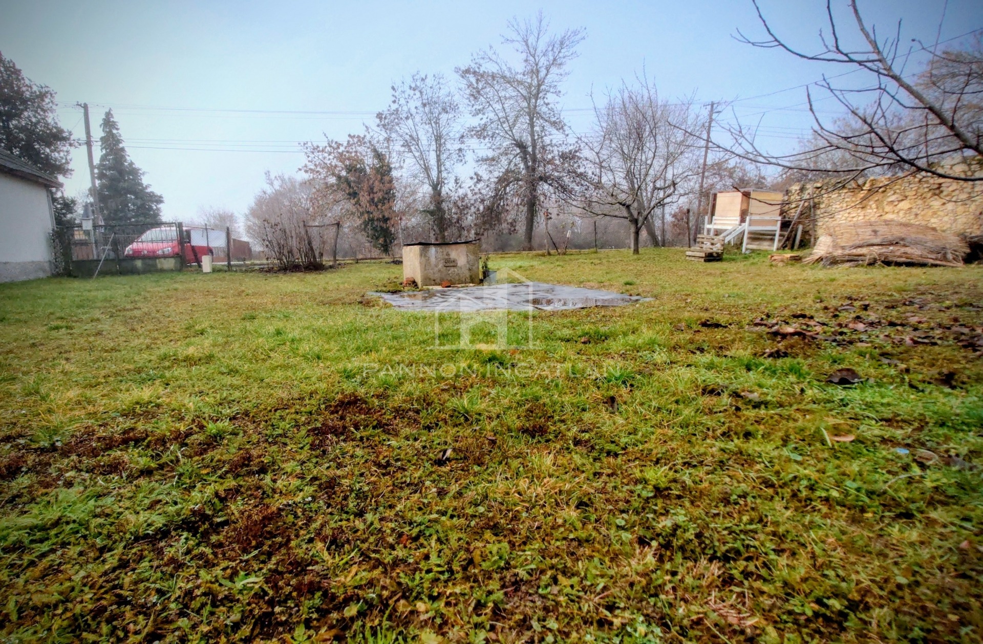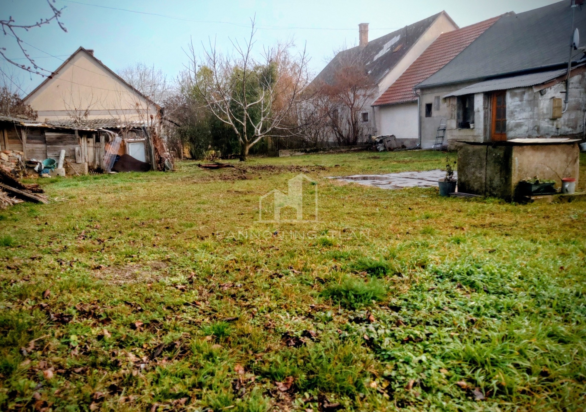 rajta egy kő és beton falazatú tároló ezen kívül van még egy könnyűszerkezetes garázs/tároló, gyümölcsfák, ásott kút az öntözéshez