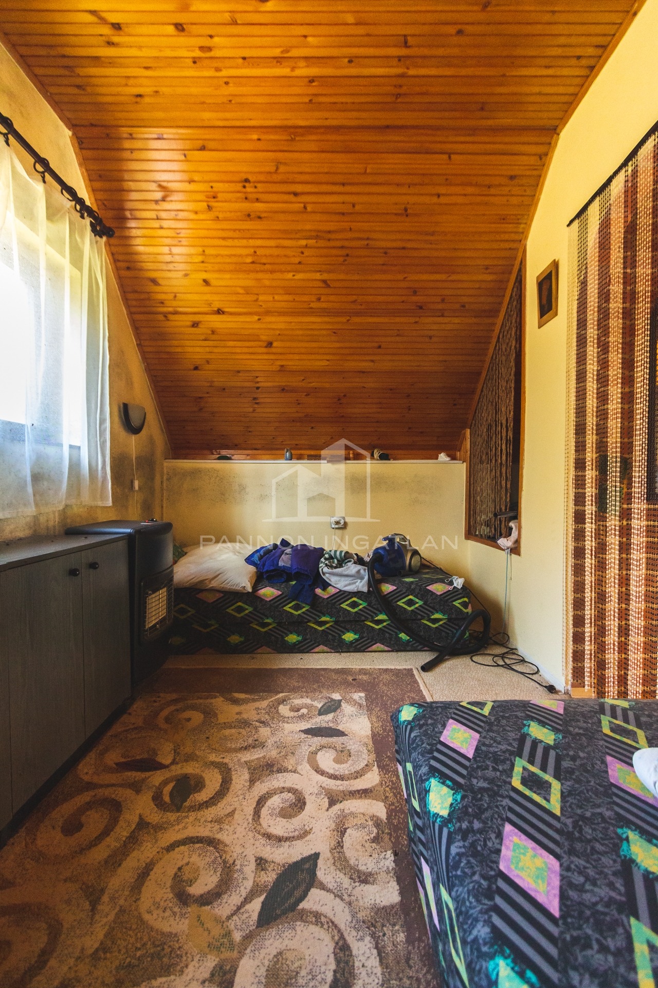 Az 1990-ben épült tégla építésű kis ház 40 m² hasznos alapterülettel, KONYHÁVAL, ÉTKEZŐVEL ÉS EGY GALÉRIÁS HÁLÓSZOBÁVAL rendelkezik, ahol a fagerendák alatt nyugodtan lehet éjszakázni.