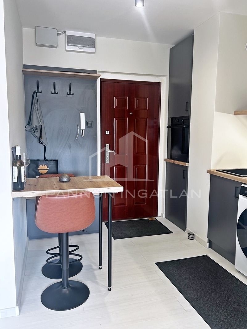 A lakásba érkezve egy praktikus előszoba és reggeliző funkciót ellátó tér fogad, ahol a teljesen új, beépített konyha található.