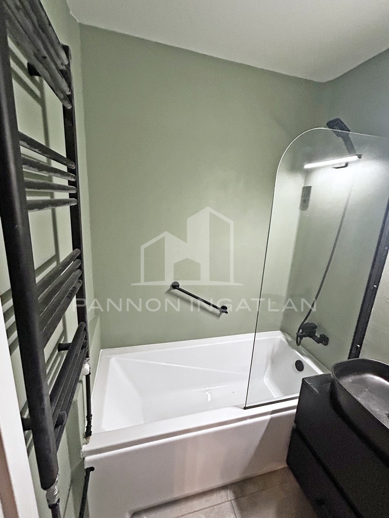 A fürdőszoba modern kialakítású, minden berendezés új és első használóra vár.